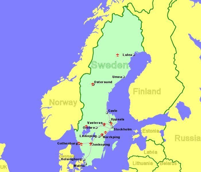 Mappa degli aeroporti Svezia. Aeroporti Svezia mappa (Europa del Nord - Europa) per la stampa. Aeroporti Svezia mappa (Europa del Nord - Europa) per scaricare. Nel 2004 c'erano circa 254 aeroporti. Nel 2005, un totale di 155 aveva piste asfaltate, e c'erano anche due eliporti come mostrato nella mappa degli aeroporti in Svezia. L'aeroporto internazionale di Arlanda a Stoccolma ha ricevuto il suo primo aereo a reazione nel 1960; altri aeroporti principali sono Sturup a Malmö e Landvetter a Göteborg. La Scandinavian Airlines System (SAS) è gestita congiuntamente da Svezia, Danimarca e Norvegia, ognuna delle quali possiede una quota del 50% della compagnia che opera nel proprio territorio; l'altra metà in Svezia è di proprietà di investitori privati. Linjeflyg, una filiale della SAS, opera un servizio nazionale verso la maggior parte delle città e delle località più grandi. Nel 2003, circa 11,586 milioni di passeggeri sono stati trasportati su voli di linea nazionali e internazionali.